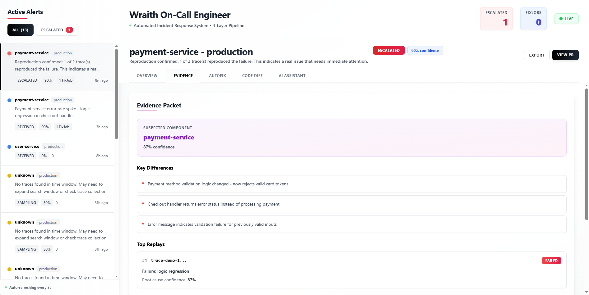 Wraith suppresses alert noise, builds service dependency graphs, replays failures to find root cause, and prepares fixes and regression tests automatically.